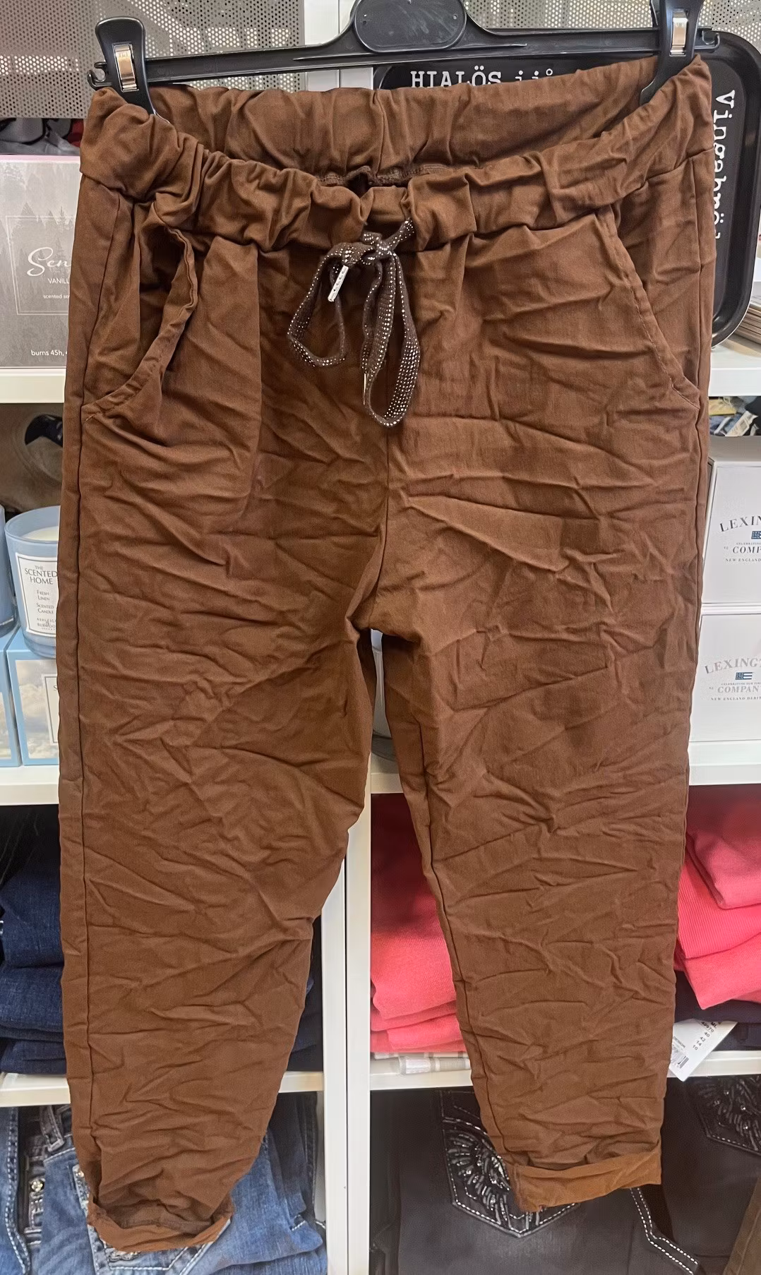 Magiska byxor brun one size 499 kr I lager. Lägg i korgen Produktbeskrivning Snygga joggers med resår och snodd i midjan. One size.