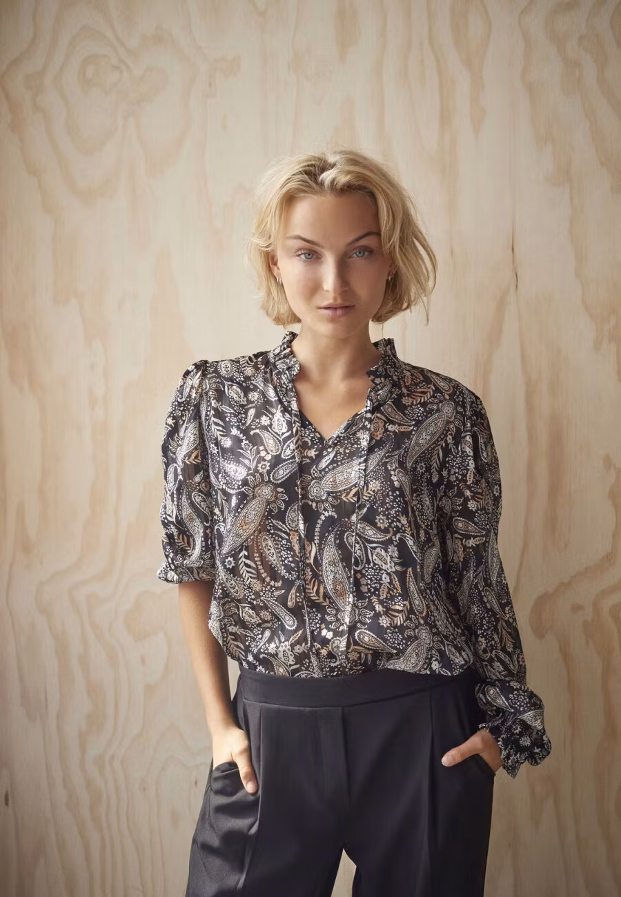 Sisters point elza paisley blus 499 kr storlek xs s m l xl I lager. Lägg i korgen Produktbeskrivning Sör paisley blus i svart och beige/aprikos/cream. 100% polyester